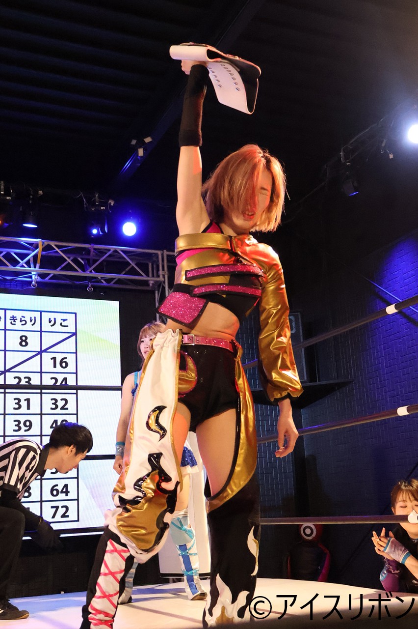 愛梨紗がシャイニングウィザードでカウント3奪取。
