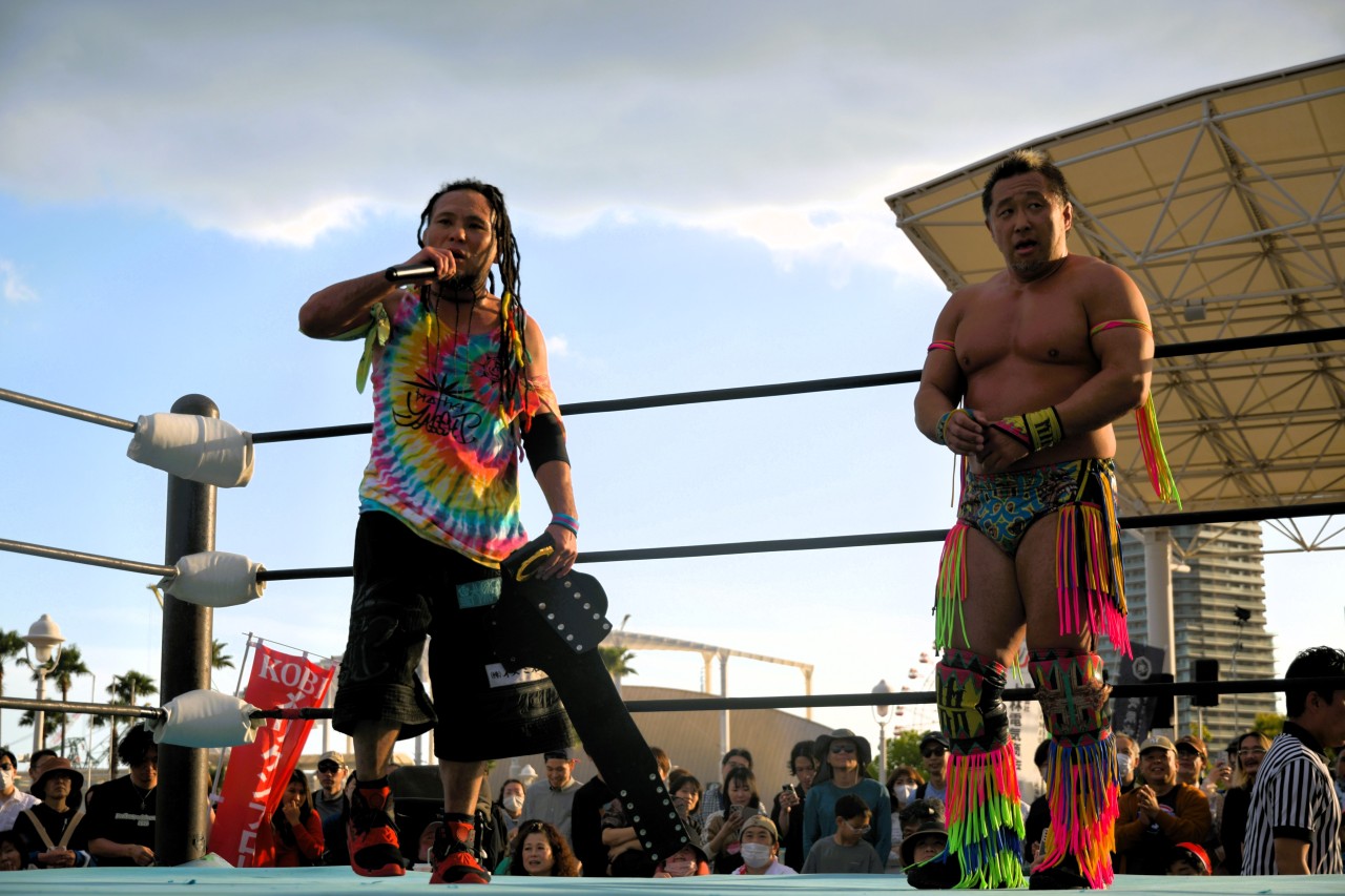YASSHIは試合後マイクを取ると「YO!きょうはメリケンパークフェス初日、ほんとうに大勢のブラザーとシスター集まってくれておおきにありがとう!きょう俺が勝てたのははるばる静岡から来てくれた修司近藤のアシストのおかげやで!近藤にマイクパスしたいとこやけども、近藤は永久にマイクなんかせえへんからカス野郎!YO!しかしきょうは久しぶりに近ちゃん招いて俺は全日本もDRAGONGATEも出てないけども、俺らはこんだけ兄弟と姉妹に囲まれて神戸で5年がんばってきてここまでたどり着けたってことを近藤に見てもらえたことが最高に幸せや!神戸をプロレスの街にしてくれたブラザーとシスターおおきにありがとう!」とごきげんちゃんのマイクで締めた。