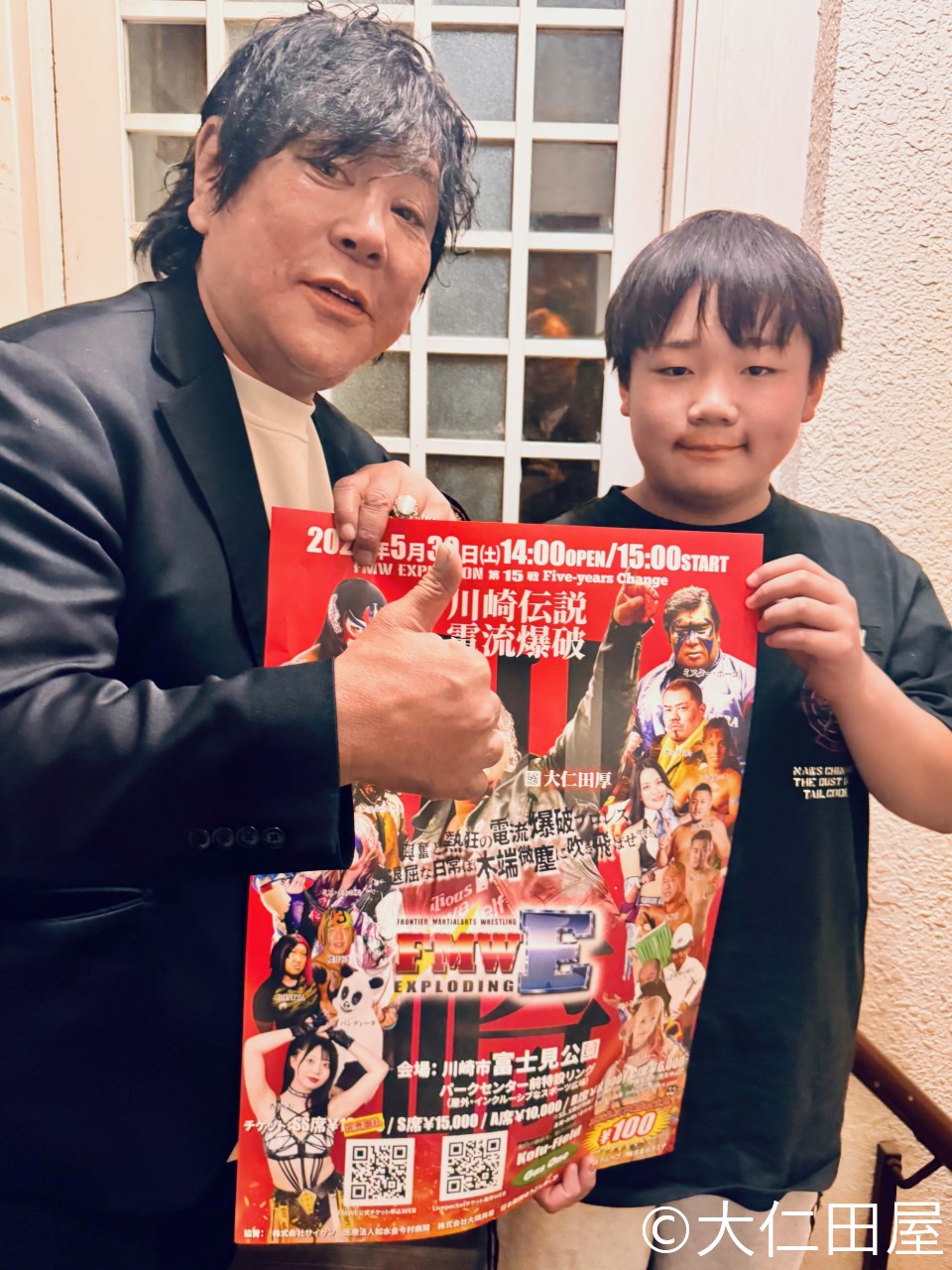 川崎市内の中学1年生の市原優雅(ゆうが)くんは、小学生だった2024年、旧川崎球場(現在の富士通スタジアム川崎)で行われた、大仁田の50周年記念大会を観戦したという。「大仁田さんからまたプロレスに誘っていただき、大興奮です。お小遣いから100円は払えるので、絶対見に行きます!」と嬉しそうに話した。
