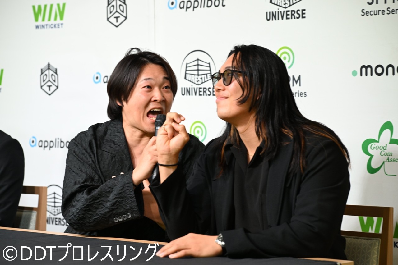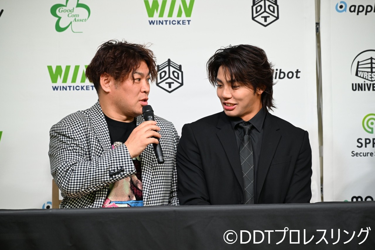 武知にピッタリ寄り添ったディーノは「KING OF DDT久しぶりにエントリーさせてもらって。何でだろうなって思ったら私の役目一つだわ。対戦相手を一人ひとりめくっていくというか、人生レベルで、めくっていこうかなと思っておりまして。なので海青ちゃんには、プロレスラーとして今まだなめられないようにとやってきたかもしれないけど、そうではない。THE RAMPAGEの武知海青、それ以前にもある人生を全部持ってきてほしい。それを1個1個よく見て、裸と裸でぶつかり合いたいなぁなんて思っております」と意欲満々。