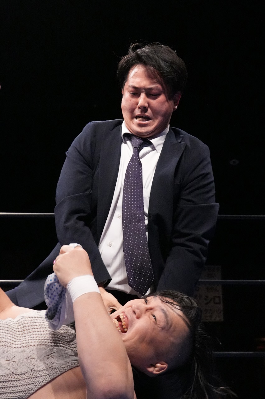 試合開始から1時間近くになったところで休憩時間を挟み、その後は(広田が扮する)シン・鹿島沙希、松澤さん、佐藤光留が立て続けに登場してリング上は大混乱。スターダムの選手に触れることが許されない条件での参戦となった光留だが、自身の欲望をムキ出しにして選手たちに迫ると、Xとしてスターダムの岡田太郎社長が現れ、光留の暴挙を阻止する。