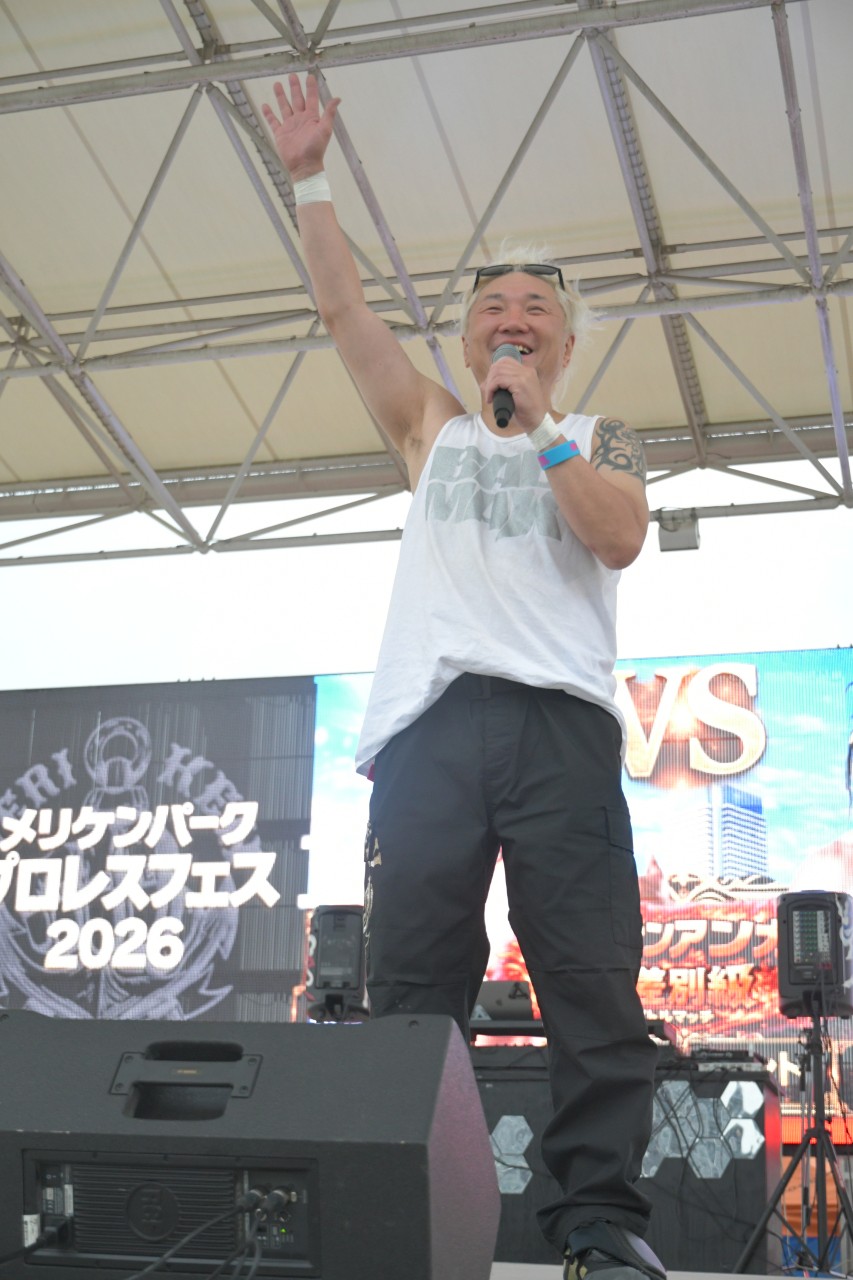 藤永幸司「メリケンパークプロレスフェス2026、無事2日間終わることが出来ました。みなさん楽しかったですか?ありがとう。来年も4月にここに戻ってきたいと思うんで発表があれば予定に入れといてください。2019年に始めてもう7年になるのかな・・・途中台風とかコロナとかで流れちゃったり延期になったりしたんですけど5回目を迎えることができました。これもみなさんのおかげです。ありがとうございます。みんなのプロレスに対する愛、集まってくれるプロレスラーの仲間、そしてボランティアで助けていただいているスタッフのみなさん、J-REXXX、DUNPMAN、一景くん、熱いライヴしていただいてほんまに感動で目がウルウルする感じになっていたんですけど。僕自身もプロレスラーとしてはメリケンパークのリングになるんで最後若手たちと対戦して無事におやじ狩りにあわないですんだので、来年はプロデュ―ス業に専念しようと思うんで、みなさん来年もメリケンパークプロレスフェスをよろしくお願いします」