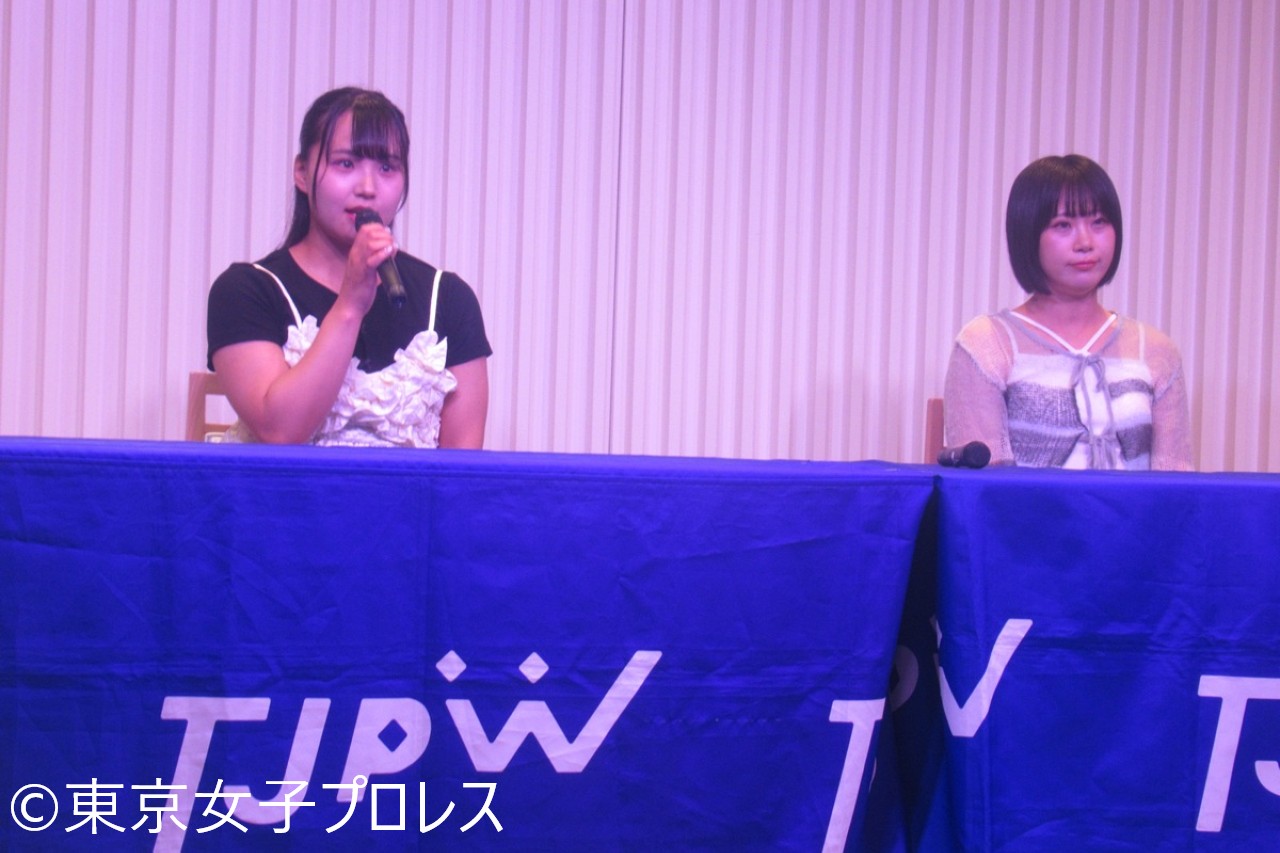 東京女子プロレスが4月23日、東京・千代田区の神田明神文化交流館で『YES! WONDERLAND '26』(5月4日、後楽園ホール)に向けて記者会見を開催した。ジ・インスピレーション(ジェシー・マッケイ&キャシー・リー)の保持するプリンセスタッグ王座に挑む白昼夢(辰巳リカ&渡辺未詩)が登壇し、タイトル戦への意気込みを語った。
