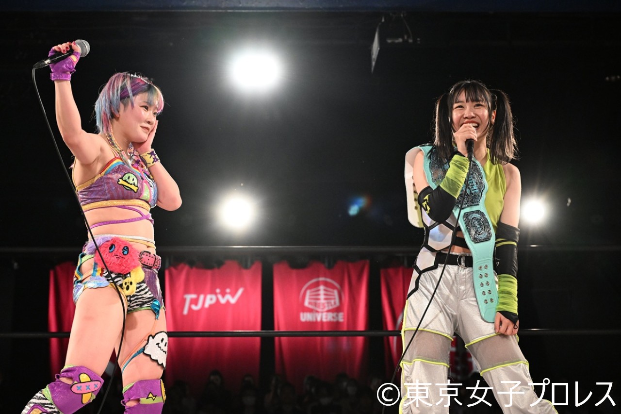 試合後、鈴芽は「色は違うけど、一緒にまたベルト持とうよ。だから後楽園ホール、私たちがまた2人でベルト持って立つところを見に来てください!」とマイク。