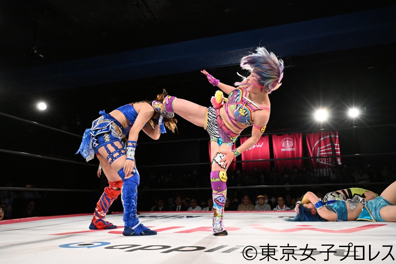 また、5・4後楽園でジ・インスピレーション(ジェシー・マッケイ&キャシー・リー)の保持するプリンセスタッグ王座に挑む白昼夢(渡辺未詩&辰巳リカ)が、上原わかな&凍雅の同期コンビと対戦。