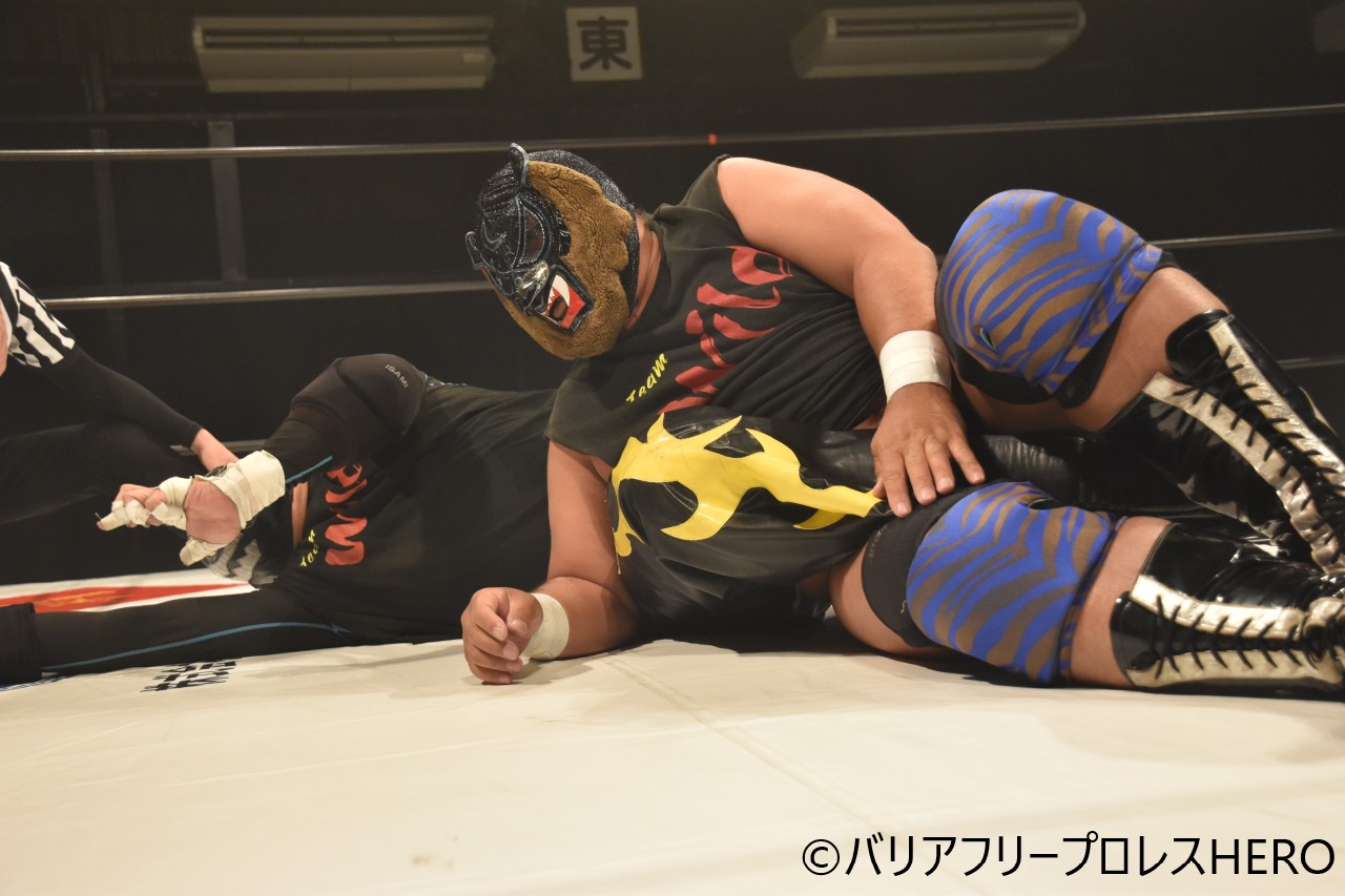 そして、ベアーは2回戦でWBCタッグ王者のダークソウル・千葉智紹と相まみえた。セコンドの加藤茂郎が介入し、場外でイス殴打などやりたい放題。加藤がダイビング・エルボードロップを見舞うも、レフェリーが加藤を強制退場に。ベアーのセコンドのワイルド・ZEROが入って、ベアーとダブルエルボー、ZEROがハイキックでアシスト。すかさずベアーが丸め込んで3カウントを奪った。