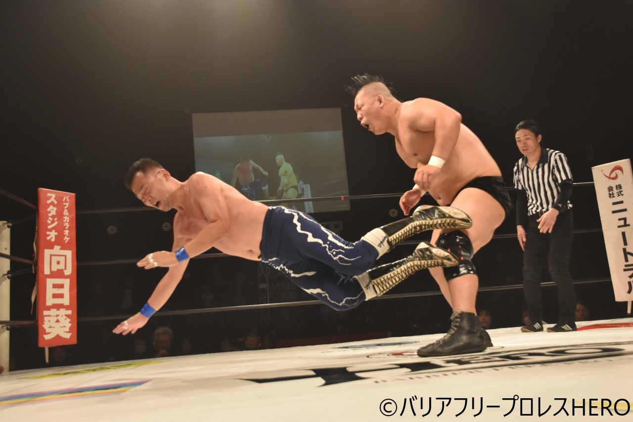 『初代WBCシングル王者決定トーナメント』準決勝では、ミステリーとシード枠で出陣となった“ターザン後藤の後継者”ガッツが激突。くしくもTTTの頂上対決がHEROマットで実現することに。両者チョップの応酬から、ミステリーはスリーパーで絞め上げた。トップロープにミステリーのノドをぶち当てたガッツは串刺し式ラリアット、ブルドッキングヘッドロック、冬木スペシャルもエスケープ。ミステリーはバックドロップ、ジャンピング・ラリアットで反撃。ガッツがラリアットを繰り出すと、ミステリーはパワースラム。さらにチョークスラムを狙うも回避したガッツは延髄斬り、ラリアット。ラリアット相打ちから、ガッツがもう一発ラリアット。最後はガッツが師匠譲りのフェースバスターを決めてピンフォールを奪い決勝戦へコマを進めた。