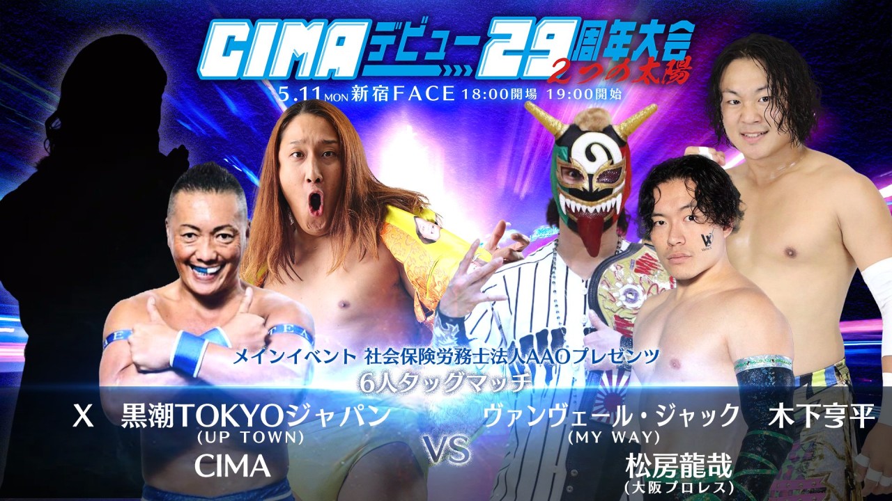 CIMA「大会タイトルの『2つの太陽』は、もちろん同じデビュー記念日のCIMAとマグナムTOKYOを指すんですけど、やっぱりこの2人を結びつけてくれたのは黒潮TOKYOジャパンなので、彼なくしてはこの大会も無かったと思いますし。で、今から僕がやりたいと思っている「底抜けに明るいプロレス」っていうのも、彼なくしては出来ない。あとは X なんですけど、スケジュールが合わず参戦動画が撮影できなかったんです。今シルエットだけ載せてるんですけど、もう皆さん想像してください。昔のクイズ番組ヒントでピントみたいに1つクリアしたらシルエットにピースが埋まっていくっていう感じでこの選手か!って。もうぐわ~って沸くと思います(ニヤリ)」