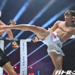 試合が始まるとセコンドの安保の声を聞き自ら前に出て打撃戦に。ストレートで予告通りダウンを奪うも、啓之輔がケージにもたれかかったところを追撃したことが反則をとられ、このダウン自体が無効に。