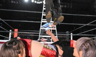 女子の師弟で凶器乱れ飛ぶハードコア戦!バケツを被せた顔面をカサで殴り、ラダーからお腹へ踏みつけダイブ!